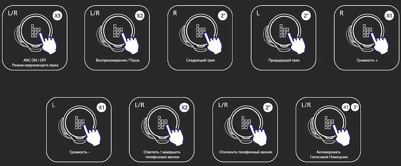 - Функции: активное шумоподавление, режим прозрачности, автопауза.