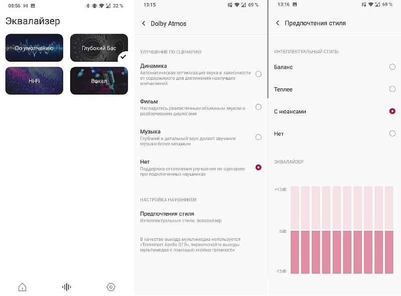 Вокал естественный и приятный как у мужских, так и у женских исполнителей. Звуковая сцена достойная по ширине. С тяжелыми динамичными жанрами Q10 справляются так себе – не хватает разрешения, но размеренная инструментальная музыка (например, пост-рок) звучит в них прилично. На высокой громкости наушники могут показаться слегка резковатыми, но поскольку Q10 неплохо отзываются на графический эквалайзер, ВЧ-фобы смогут с ними совладать. Для себя опытным путем я вывел следующий тюнинг с помощью фирменного приложения и системных эффектов Dolby Atmos: