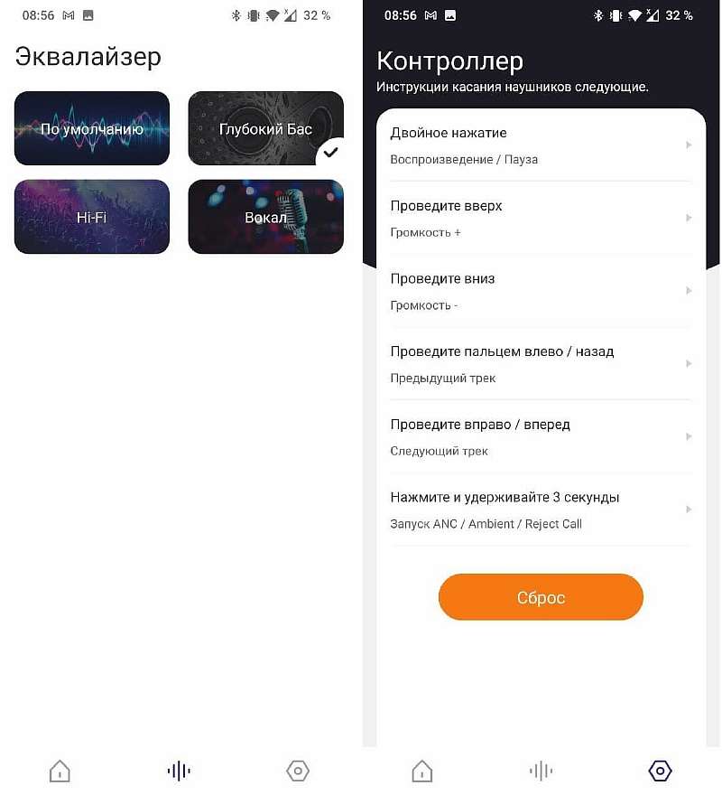 По функциональности приложению не хватает только полноценного графического эквалайзера. Из важных опций присутствует отображение заряда наушников, возможность обновить их прошивки по воздуху, смена режимов ANC, три пресета эквалайзера (глубокий бас, Hi-Fi и вокал – поднимающие низкие, средние и высокие частоты соответственно), а также возможность настройки управления под себя.