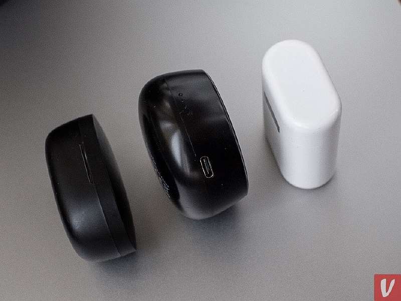 На торцах кейса, помимо кнопки для его открытия, расположено два функциональных элемента – полоска из четырех светодиодных индикаторов, которые указывают на текущий уровень заряда встроенного в футляр аккумулятора, и порт Type-C. За наличие последнего в бюджетной гарнитуре разработчикам следует пожать руку.