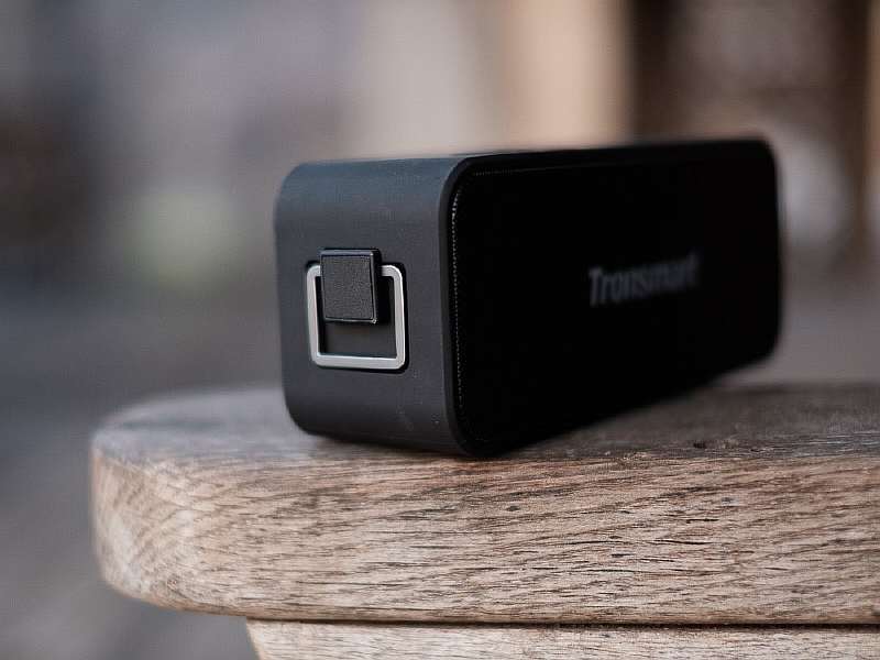 Также есть полезный прямоугольный зацеп, позволяющий подвешивать динамик на карабинах и различных креплениях. Это удобно и практично, старшей версии T6 Plus, на которую у нас тоже есть подробный обзор, этой фишки очень не хватает.