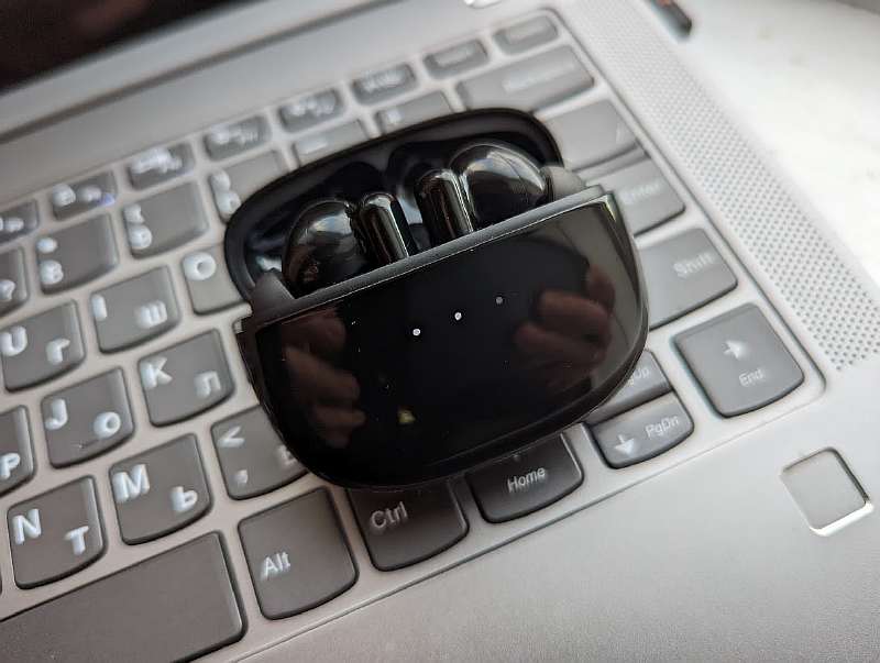 Как уже говорилось, заряжается кейс через Type-C, а три светодиодных индикатора отображают остаток батарейки, что удобно. Для полной зарядки вкладышей требуется около полутора часов, а для зарядки кейса — около двух часов. Опции быстрой зарядки нет, но она все равно достаточно шустрая: 15 минут внутри кейса дают 70 наушникам минут воспроизведения.
