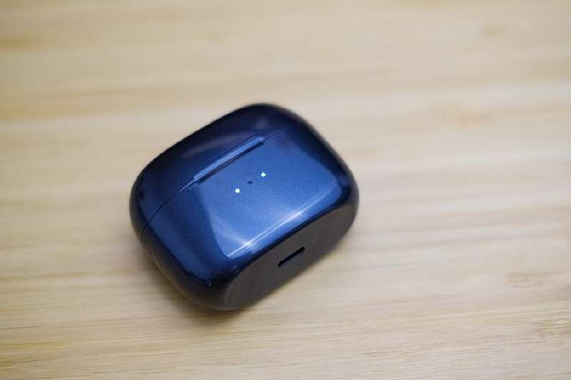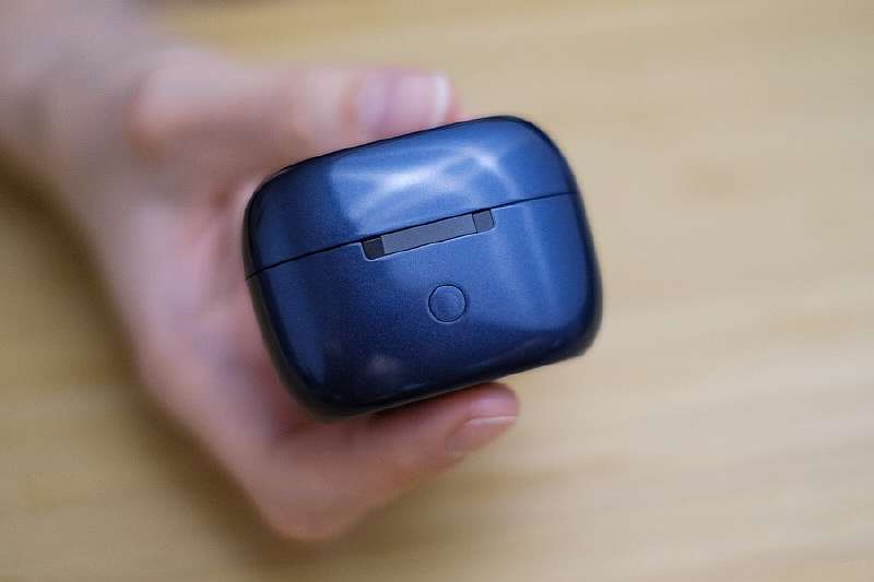 Начнем с кейса, который выглядит ощутимо дороже, чем ожидаешь от наушников за 50$. Он сделан из гладкого перламутрового пластика, имеет компактные размеры и плоское дно, благодаря чему уверенно стоит на ровных поверхностях. Светодиоды спереди показывают остаток батареи, а также дают понять, полностью ли заражены наушники внутри – крайние индикаторы мигают во время зарядки. Все продумано и удобно.