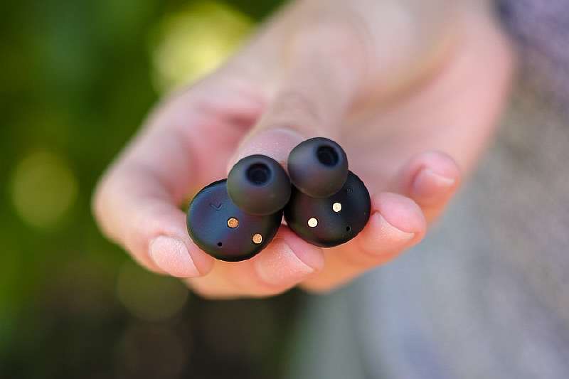Сами наушники тоже сделаны из матового пластика, но декоративная окантовка вокруг сенсорной зоны у них глянцевая. На внешней стороне бочонка расположены небольшие светодиоды, которые подсвечиваются во время зарядки и мигают при поиске источника воспроизведения.