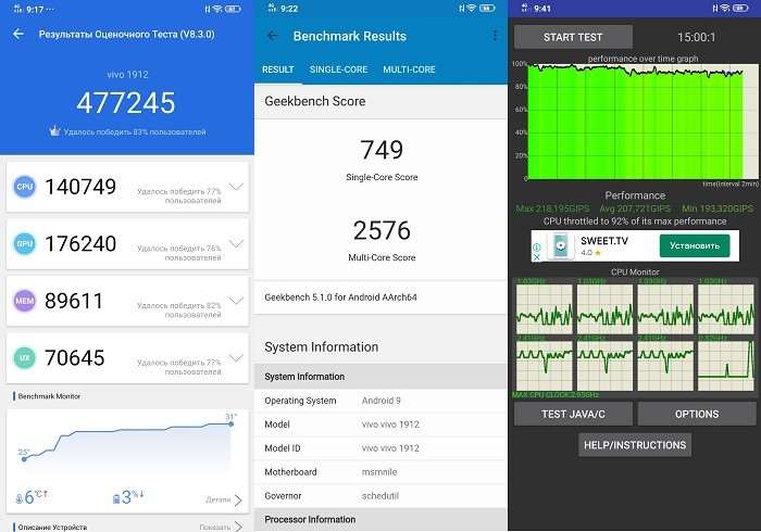 Продвинутая система охлаждения на базе испарительной камеры делает свое дело и под нагрузкой смартфон практически не греется. Результаты теста на троттлинг, а также AnTuTu и Geekbench приведены на скриншотах ниже.
