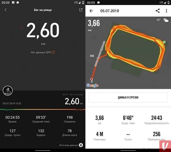 Без доступа к геолокации трекер серьезно привирает в вопросе преодоленного расстояния. На скриншоте снизу можно увидеть статистику одной и той же пробежки: слева – Mi Fit без GPS, справа – приложение для пробежек с доступом к GPS.