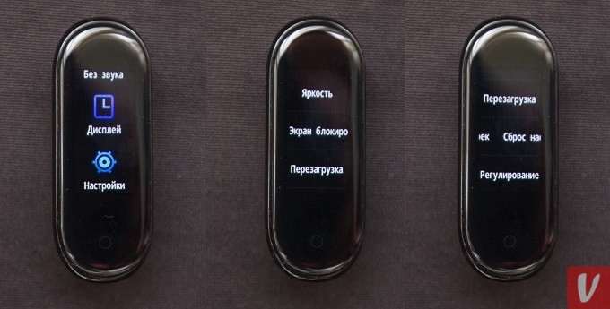 - Настройки. Тут можно изменить яркость дисплея, перезагрузить браслет, сбросить настройки или почитать системную информацию об устройстве.