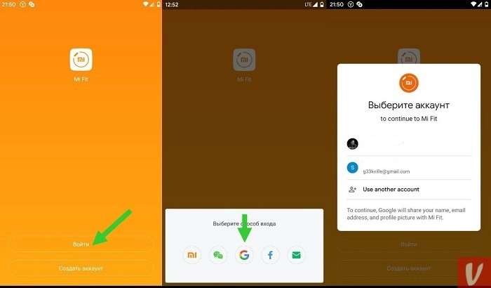 - Запускаем Mi Fit и выбираем способ входа: можно создать аккаунт в самом приложении, либо залогиниться через электронную почту, что проще и быстрее.