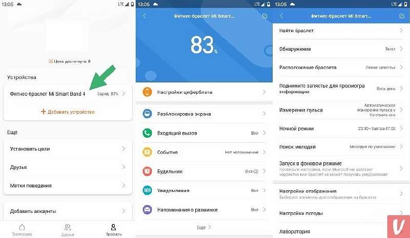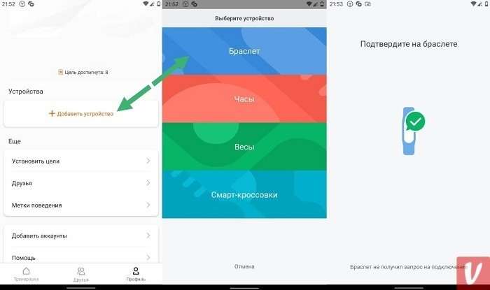 - Далее подключаем Mi Band 4: переходим на вкладку «Профиль», нажимаем «Добавить устройство» и выбираем «Браслет» — начнется поиск гаджета, на котором потребуется подтвердить запрос на подключение тапнув по галочке.