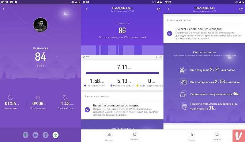 Помимо мониторинга физической активности Mi Band 4 умеют отслеживать сон, с чем он справляется не всегда хорошо. Общая продолжительность сна нередко определяется с заметной погрешностью, также браслет может упускать из виду ночные пробуждения. Умный будильник, автоматически срабатывающий в фазе легкого сна, в девайсе не реализован.