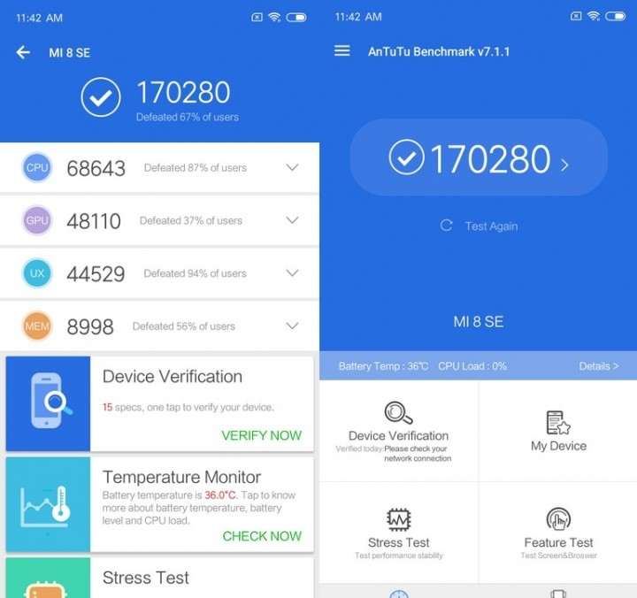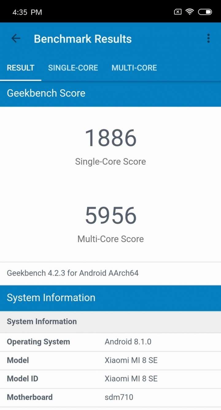 На сегодняшний день Snapdragon 710 является лучшим вариантом по части производительности, если вы не желаете переплачивать за флагман с 845-ым драконом. Xiaomi Mi8 SE без проблем ворочает любые игрушки на максимальных настройках графики, демонстрирует при этом адекватное энергопотребление и практически не греется под нагрузкой. В AnTuTu гаджет набрал 170 тыс. баллов, что является отличным показателем для смартфона среднего уровня, производительность в сравнении с конкурентами на базе Snapdragon 660 выше почти на 30%.![]()