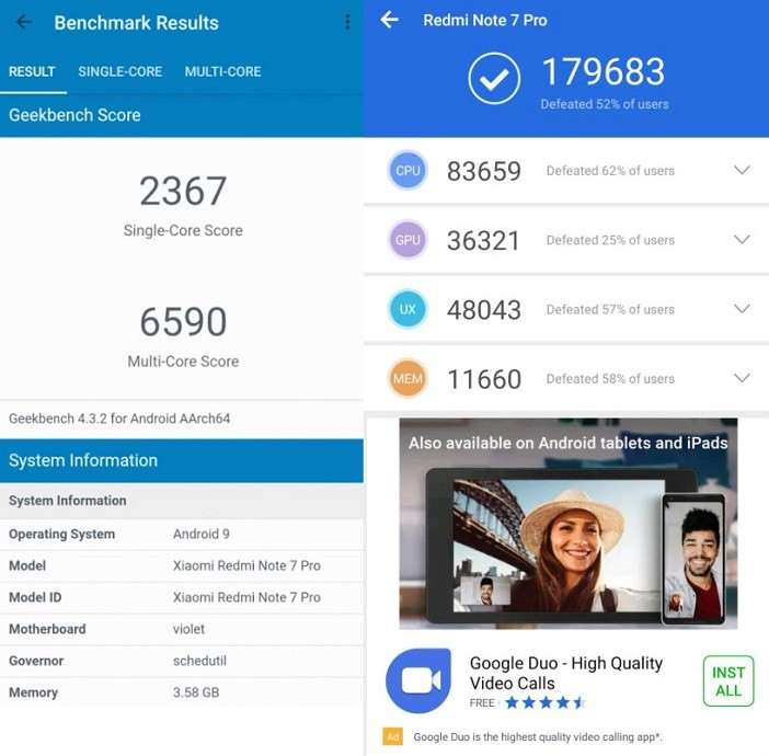По большей части Redmi Note 7 Pro – это быстрый и плавный телефон, но разница в скорости, в сравнении с флагманами Pocophone F1 и Xiaomi Mi 8, все же ощущается. Причина – использование в семерке более медленной памяти стандарта EMMc 5.1, а не флагманской UFS 2.1. Почему по большей части? Периодические микроподлагивания анимаций при разблокировке телефона или навигации по меню, а также выгрузка работающих в фоне приложений из ОЗУ, несколько портят впечатления от его использования. Однако стоит понимать, что подобное положение дел характерно для большинства смартфонов Xiaomi на старте продаж, и со временем оптимизацию системы доведут до ума.