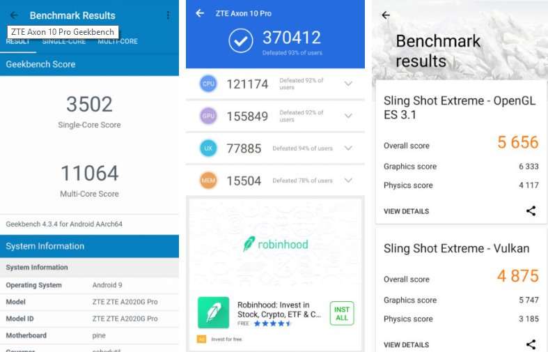 Сердцем Axon 10 Pro является процессор Snapdragon 855, который выводит модель на лидирующие места в списках самых мощных Android смартфонов. В AnTuTu девайс набирает 370.5 тыс. баллов, что сопоставимо с результатами Xiaomi Mi 9 и OnePlus 7.