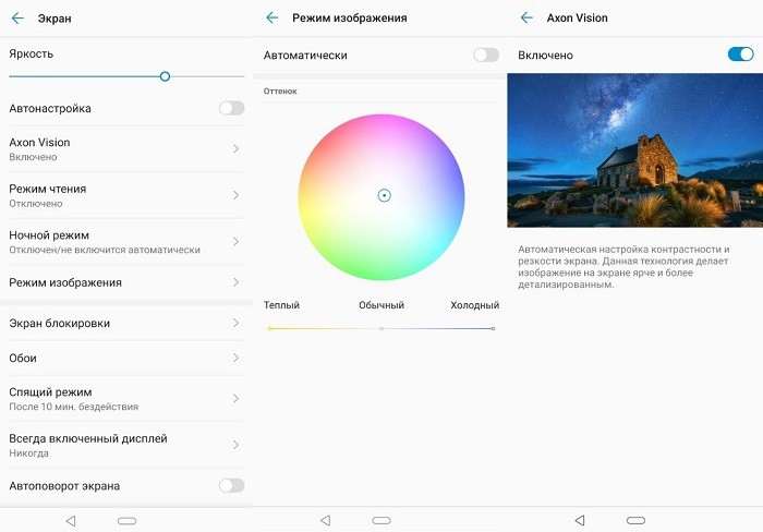 Цветовая температура тут хорошо откалибрована по умолчанию, но при желании баланс белого можно настроить. Доступна ручная регулировка и автоматическая подстройка ББ под условия окружающего освещения, которая крайне редко встречается в Android смартфонах. Для ее работы в Axon 10 Pro предусмотрен специальный RGB датчик, но на деле функция часто лажает. Обычно она выставляет излишне высокую цветовую температуру, из-за чего экран желтит, словно при включенном режиме чтения. В общем ББ лучше один раз настроить и забыть, а вот еще один улучшайзер — Axon Vision, со своими задачами справляется вполне неплохо.
