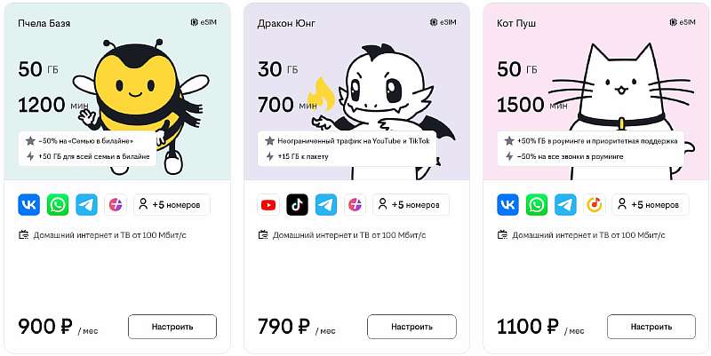 - Билайн «Тариф Up (Дракон Юнг) – 790 рублей: 700 минут, 30 ГБ интернета (+15 ГБ за счет бонусов). Безлимитные мессенджеры, музыка, социальные сети и видеосервисы (YouTube, TikTok).