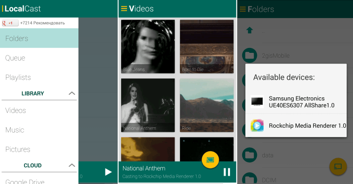 LocalCast — это не столько видеоплеер в привычном понимании, сколько программа для трансляции с вашего смартфона. Работает она не только с видео, но также музыкой и картинками. Мультимедийный контент можно просматривать буквально откуда угодно: хранилищ Google Drive, Google+, Dropbox или сайтов, с Chromecast, SmartTV, Roku, Nexus Player, Apple TV, Amazon Fire TV или Stick, Sony Bravia, Samsung, LG, Panasonic и других, приставок Xbox 360, Xbox One, а также DLNA устройств.