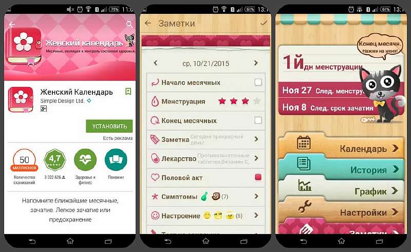 Тренировки тесно связаны с женским здоровьем, поэтому не будет лишним держать под рукой приложение для контроля месячного цикла. Пожалуй, лучшее из них — это «Женский календарь». С его помощью легко отслеживать дату следующей менструации, фертильность, вести запись о половом настроении и сопутствующих симптомах. Графики изменения веса и температуры тела также не будут лишними.