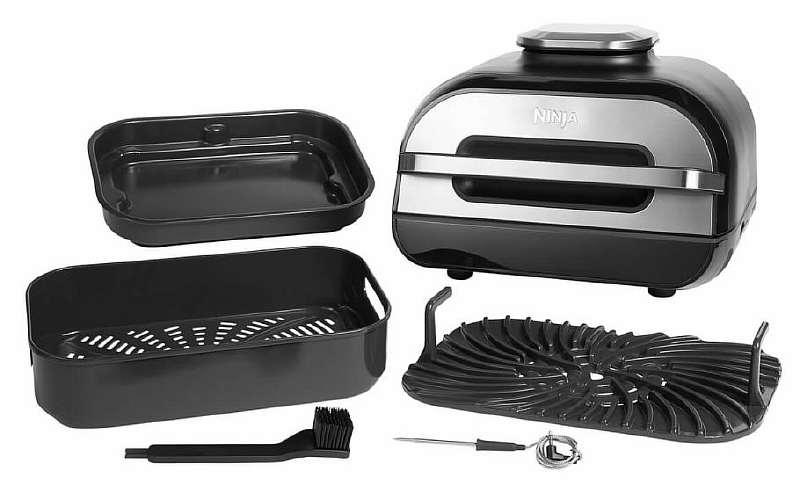 Все комплектующие удобно снимаются и прекрасно моются в посудомоечной машине. На борту 6 автоматических режимов на все случаи жизни: выпечка, гриль, жарка, запекание, разморозка, сушка и томление/тушение, с возможностью регулировки всех параметров вручную. Ну и топовое решение от американцев — цифровой кулинарный щуп. Аксессуар подключается к грилю, засовывается в мясо и вы получаете именно ту степень прожарки, которую хотите. Кстати, «отдыхать» стейкам в фольге с таким устройством не нужно. Для этого тут есть специальный режим: просто закрываете крышку, и таймер через 5 минут уведомляет, что блюдо можно подавать на стол.