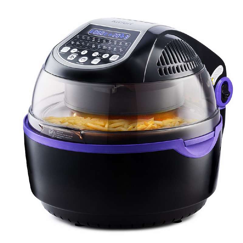 Вместо механического у аэрогриля электронное управление с цифровым дисплеем, но автоматических программ все равно нет, только изменение температуры и времени готовки. Зато имеется полезная возможность сохранять выбранные параметры, чтобы потом выставлять их одним нажатием при готовке любимых продуктов. При малом объеме чаши прибор получился довольно тяжелым и габаритным, но при такой мощности это неудивительно. KT-2209 — качественный домашний аэрогриль для тех, кого размеры чаши в 3.2 л полностью устраивают.