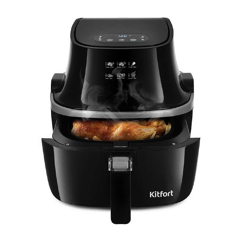 В рейтинг лучших аэрогрилей попал еще один Kitfort, причем модель KT-2219 можно назвать продвинутым и богатым на функции устройством. Она представляет собой классический аэрогриль с откидной крышкой на кронштейне. Дизайн современный, мощность — 1400 Вт, а объема в 10 литров хватит, чтобы приготовить курицу и гарнир к ней сразу на большую семью. Удобное сенсорное управление дает доступ сразу к 20 автоматическим программам, так что запариваться с выставлением настроек вручную здесь не придется.