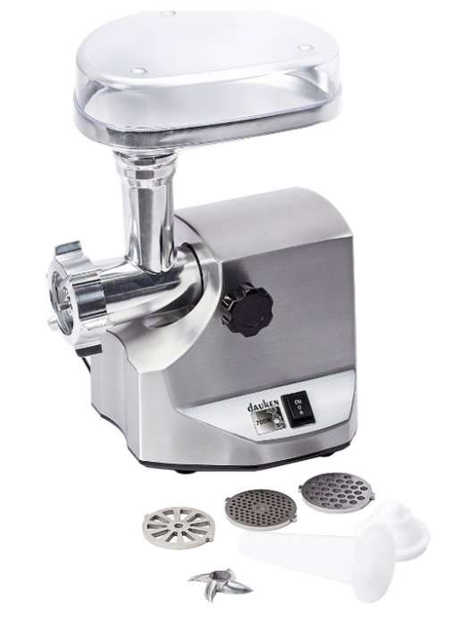 Электромясорубка Dauken FW2000 стоит дороже предыдущей модели от Moulinex, но тут из металла уже выполнены все важные узлы, в том числе шестерни. Сборка качественная, ничего не люфтит, швы и стыки ровные, нержавейка за эти деньги приличная — толще будет только в устройствах премиум сегмента. За счет 750 Вт мощности и реально острых ножей, которые хорошо держат заточку, мясорубка с легкостью справляется с любым мясом.