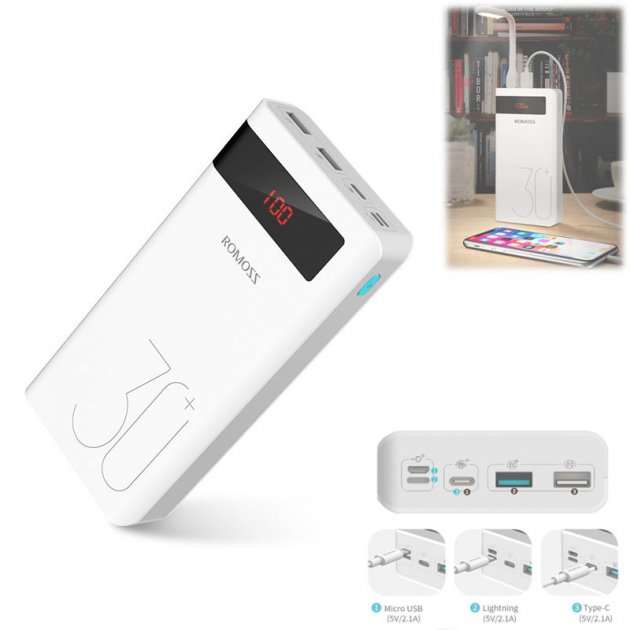 Качественный и доступный вариант для тех, кто ищет, какой повербанк выбрать с большим запасом емкости. Romoss имеет приятный внешне, увесистый пластиковый белый корпус, 5 портов (2 обычных USB, Type-C, Apple Lighting и micro-USB) и может одновременно заряжать до 3 гаджетов одновременно. Причем по быстрой зарядке здесь подпитывается не одно, а сразу 2 устройства.