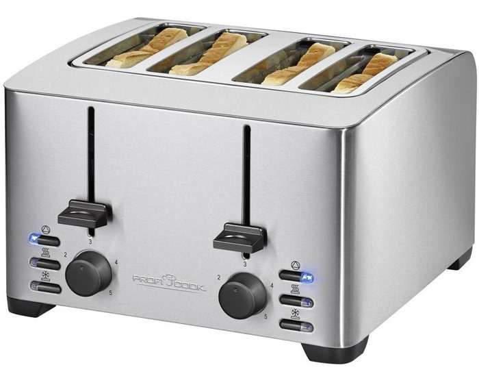 Зато есть очень большое преимущество: у ProfiCook два отдельных блока управления для каждого из отсеков. То есть если надо поджарить пару тостов, а не 4, можно включить разогрев на одной «половине». В остальном – качественный тостер со всем необходимым: есть решетка для подогрева булочек, неслабая мощность 1500 Вт с 5 уровнями прожарки, разморозка, подогрев, автоцентрирование тостов, экстра-подъем. На большую семью, где все любят хрустящие гренки, или в офис – подойдет идеально.