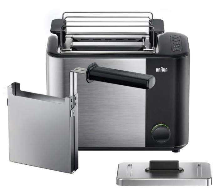 Флагманская модель от Braun с расширенным функционалом. Во-первых – предусмотрена крышка, чтобы в отсеках не скапливалась пыль, и тосты быстрее обжаривались во время работы. Во-вторых – в комплекте есть съемный контейнер для сэндвичей, в который можно положить и разогреть уже готовый бутерброд. Последняя фича в целом малополезная. Корочка сквозь стенки контейнера не делается, а просто разогреть сэндвич удобнее в микроволновке.