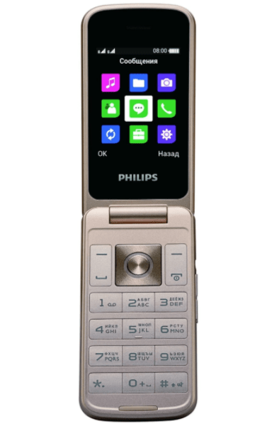 От экзотики переходим к более привычным устройствам. Популярная раскладушка от Филипс хорошо зарекомендовала себя в качестве телефона для пожилых людей. Ее трудно разбить, ведь экран спрятан внутри корпуса, а приличной диагонали в 2.4-дюйма хватает, чтобы вся информация была читаемой. Мультимедийный динамик звучит не только громко, но и чисто, с куда меньшими искажениями, чем у конкурентов по аналогичной стоимости. На качество микрофона и разговорного спикера у владельцев тоже нет никаких нареканий.