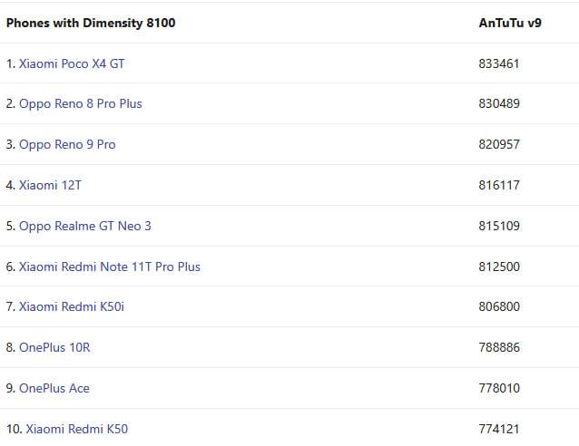 В завершение прикладываем рейтинг самых мощных смартфонов на Dimensity 8100 по версии AnTuTU.