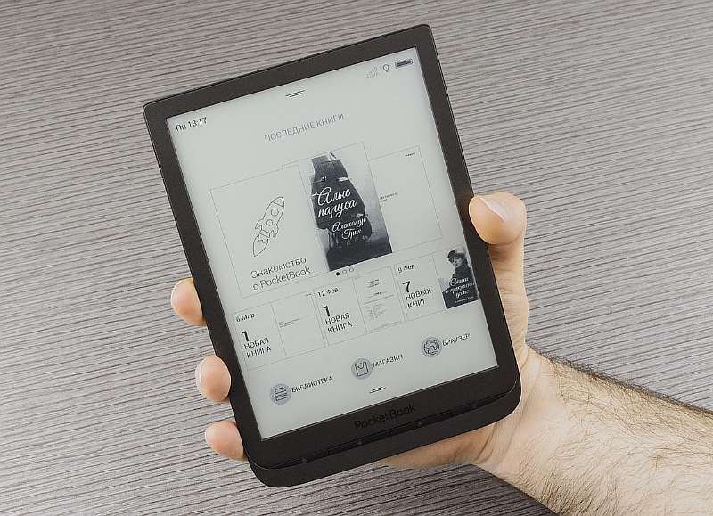 Возглавляет топ электронных книг PocketBook 740 – самая навороченная читалка на данный момент, сохраняющая адекватный ценник. Судите сами: тут 7.8 дюймовый экран с комическим разрешением, но за счет тонких рамок габариты ридера не сильно отличаются от 6 дюймовых аналогов, регулируемая подсветка, топовая автономность.