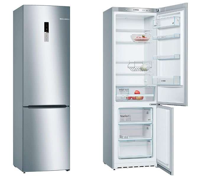 Этот «Бош» уже смотрится современно и стильно (хотя и ценник у нее в полтора раза выше, чем у бюджетных вариантов), имеет LED-дисплей по центру двери холодильного отсека, который позволяет выбирать нужную температуру, а не просто крутить колесико наугад.