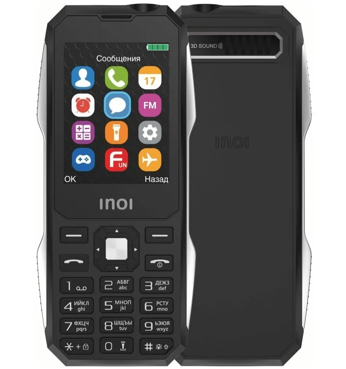 Сотовый от отечественного производителя INOI попал в подборку не только из-за патриотических чувств. Брендом он рекламируется как звонилка для военнослужащих и по факту вполне соответствует этому званию. Имеется усиленный корпус с металлическими вставками и спинкой из матового пластика, что обеспечивает цепкий хват. Крупный 2.4-дюймовый экран яркий и хорошо читается на солнце. Функционал, что называется – ничего лишнего: два слота под SIM, радио и достаточно приличный фонарик, бьющий на пару метров вдаль.