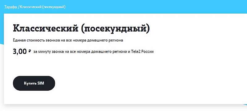 Tele2 тоже не особо радует по части разнообразия. Самые выгодные тарифы без абонентской платы у этого мобильного оператора, как и у МегаФона, сводятся к одному предложению — это «Классический (посекундный)». Название говорит само за себя. Никаких лишних подписок, честная посекундная тарификация звонков, где абонент платит ровно столько, сколько успел наговорить: