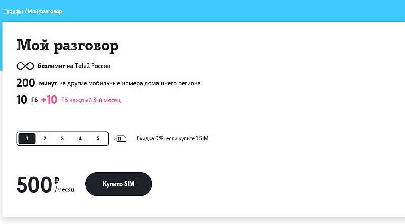 Пакетный тариф для разговоров и интернета. Ценник чуть ниже, чем у ближайших конкурентов, и на первый взгляд, тут очень мало минут, но это компенсируется безлимитными звонками на Tele2, которые оператор не стал делать платной опцией.