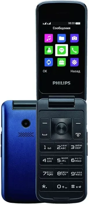 Тонкая и легкая (82 грамма) раскладушка от Филипс получает серебро рейтинга. Это максимально простой аппарат без наворотов с упором на базовый функционал и качество сборки. У модели два громких динамика: внешний и разговорный, приятный дизайн с яркими расцветками и мягкая, качественная клавиатура с раздельными клавишами. Ответ/сброс вызова при открытии крышки, разумеется, присутствует.