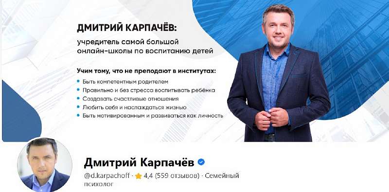 Психолог широкого профиля Дмитрий Карпачев готов поделиться со своими подписчиками мыслям о любви, воспитании детей, успехе и всем остальном, на что обычно клюют блуждающие по интернету и скучающие люди. За качество советов ручаться не станем, но почти миллион человек находят в них что-то интересное.