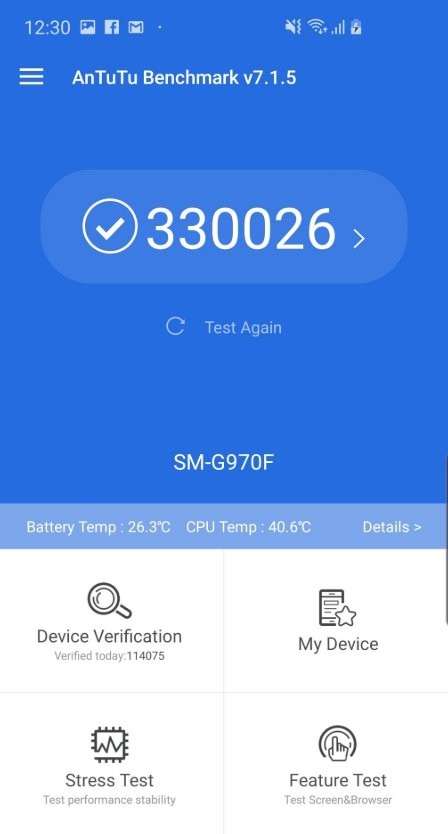 Смартфон ощущается очень быстрым: идеально плавный интерфейс буквально летает, приложения открываются без задержек. В тесте AnTuTu Galaxy S10e набирает 330 тыс. баллов. В PUBG на ультра-настройках частота кадров составляет 35-40 fps, нагрев корпуса спустя пол часа игры не превышает 40 градусов.