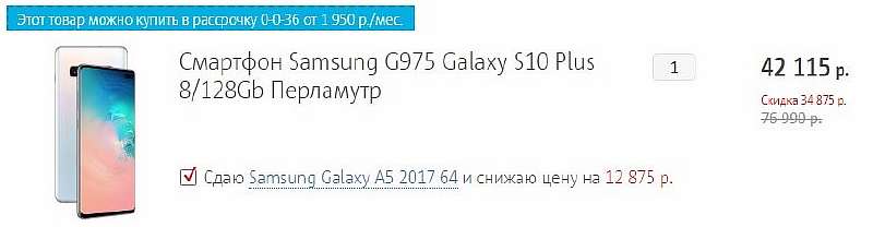 Скидку дают сразу по двум направлениям. Нужно использовать промокод MART34, он срежет 15 тысяч от первоначально цены, а также сдать старый смартфон в трейд-ин. За абсолютно любое устройство дадут дополнительную скидку в 10 тысяч, к которым добавиться стоимость самого девайса по трейд-ину. В итоге, что бы вы не сдавали, S10+ будет стоить не дороже 44 990 рублей.
