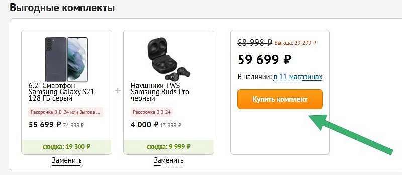 Чтобы забрать Galaxy S22 со скидкой, переходите в DNS и кликайте «Купить комплект» в нижней части страницы. Дополнительная скидка в 2250 рублей сработает за онлайн-оплату – нужную ссылку прикладываем.