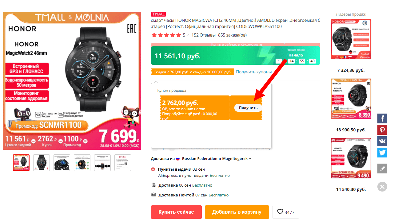 Чтобы купить Honor Magic Watch 2 со скидкой, ныряйте по ссылке, берите купон продавца и оформлении заказа вбивайте промокод SCNMR1100. Акция продлится до 1 сентября.