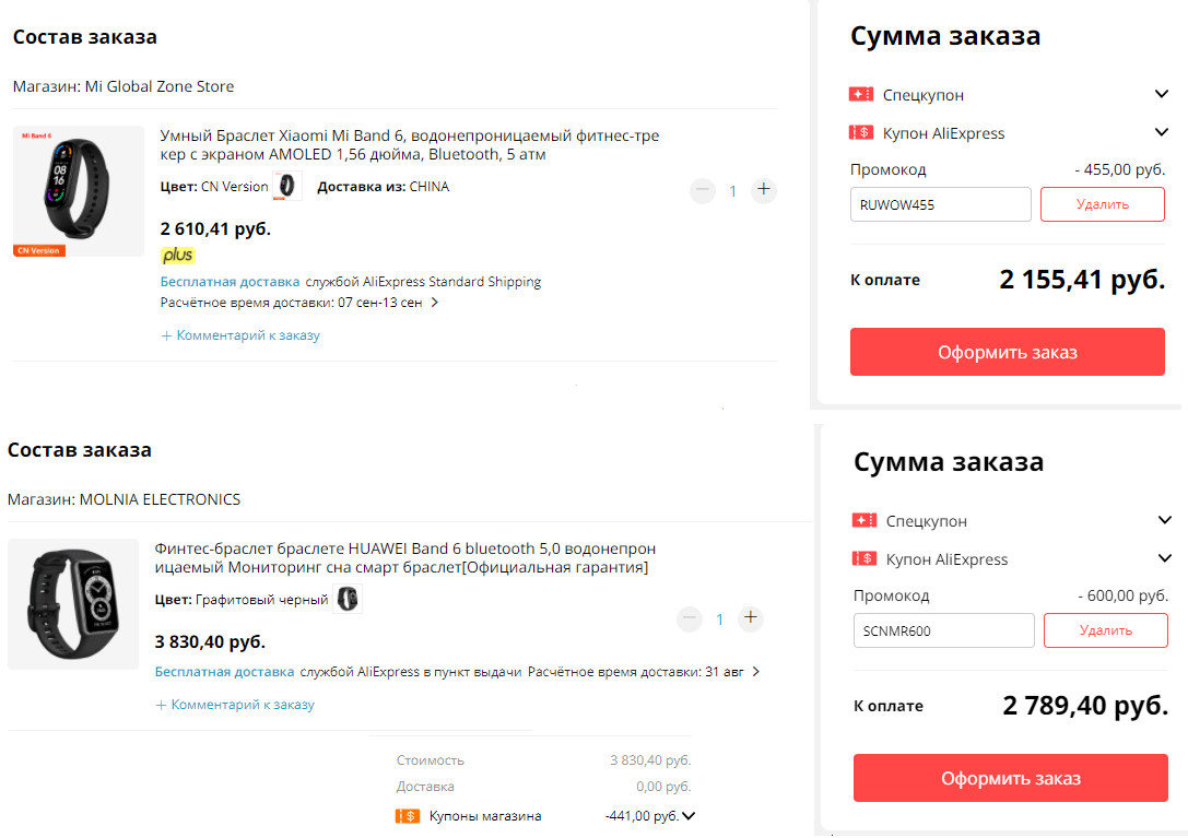 Гаджеты доступны со скидкой на распродаже Али, которая продлится еще 2 дня. Чтобы получить их по акционной цене, нужно взять купон на странице товара, а при оформлении заказа использовать промокоды: RUWOW455 для Xiaomi Mi Band 6 и SCNMR600 для Huawei Band 6. Последний реализуется на Tmall и доступен с быстрой доставкой из России.