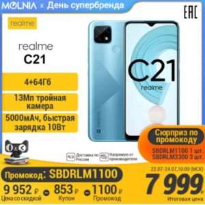 Обнаружили очень выгодную скидку на российском TMall. С 22 июля там будут распродавать бюджетный смартфон Realme C21 в конфигурациях 3/32 и 4/64 Гбайт. Базовую версию выставили за 7 399 рублей, а за топовый вариант просят 7 999 деревянных.