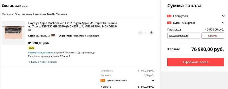 Чтобы получить скидку, переходите в магазин на Tmall и вбивайте промокод WOWHOME5000 при оформлении заказа. Есть информация, что 11.11 ноутбук выставят чуть дешевле, за 74 257 рублей по промику LOUDSALE, так что если хочется сэкономить еще сильнее, можно подождать главную распродажу этого года.
