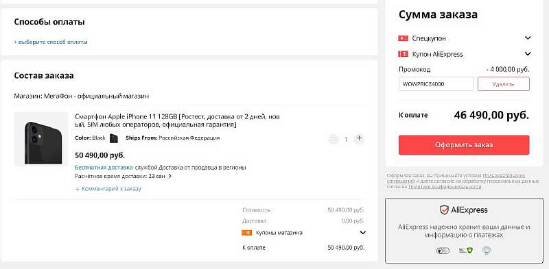 Чтобы забрать iPhone 11 по скидке, нужно применить промокод WOWPRICE4000 при оформлении заказа. Акция будет длиться до 26 сентября, но телефоны отгружают небольшими партиями, поэтому не пугайтесь, если будет указано, что товар закончился. Просто периодически обновляйте страничку и ждите нового поступления.