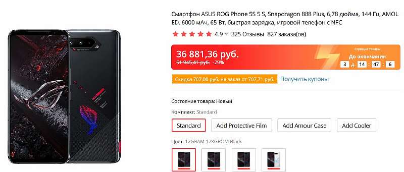 Прямо сейчас ASUS Rog Phone 5S выставили на AliExpress за 36 881 рубль – это отличная цена, ведь в России такой девайс продавался у официалов за сумасшедшие 99 тысяч. А если взять купон продавца, то получится сэкономить еще 707 рублей. Вот ссылка на акцию.