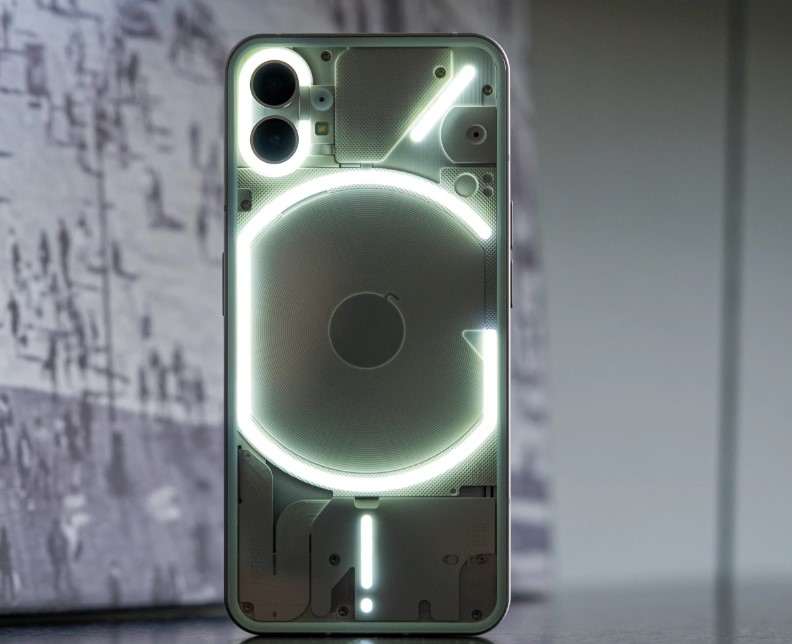 Nothing Phone (1) получил прозрачный корпус, открывающую вид на катушку беспроводной зарядки и блок основной камеры. Под спинкой установлено 900 светодиодов, которые нужны для светомузыки, показа уровня заряда батареи и различных уведомлений.
