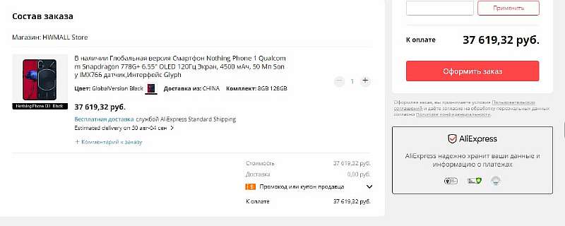 Чтобы купить Nothing Phone (1) со скидкой, переходите по ссылке на AliExpress, добавляйте модель в корзину и оформляйте заказ. Никакие промокоды вводить не требуется.