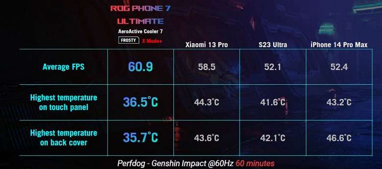 В этом году компания решила выпустить две версии: ROG Phone 7 и 7 Ultimate. Различий между ними не так много, как можно было бы ожидать. Более продвинутая версия имеет дополнителый 2-дюймовый экран для отображения информации на задней панели, а также автоматически открывающуюся заслонку для подключения кулера Aeroactive Portal, что повышает эффективность системы охлаждения. Вот разница в температурах с другими актуальными флагманами: