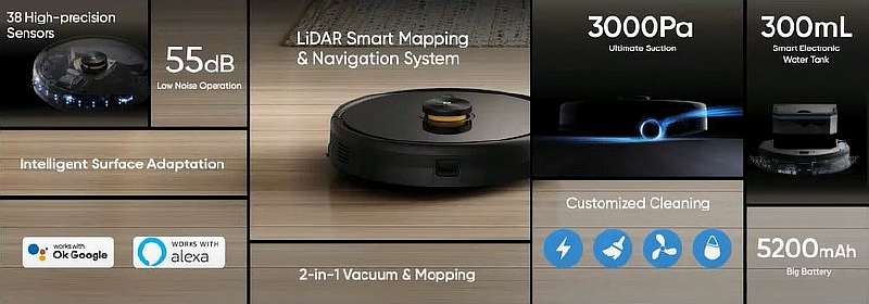 Realme TechLife Robot Vacuum – это функциональный робот с поддержкой сухой и влажной уборки, а также передовой системой навигации. Девайс оборудован сканером LiDAR и 38 датчиками для сканирования пространства, с помощью которых он в режиме реального времени строит 360° карту помещения и передает ее напрямую в фирменное приложение. Там пользователь может выбрать зону, режим уборки, расход воды и силу всасывания для каждой из комнат.